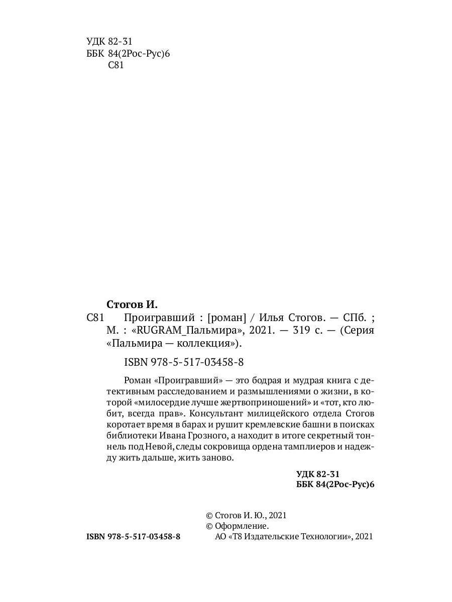 Handling time: 19 days Автор: Стогов Илья, «Проигравший»: Роман «Проигравший» — это бодрая и мудрая книга с детективным расследованием и размышлениями о жизни, в которой «милосердие лучше жертвоприношений» и «тот, кто любит, всегда прав». Консультант милицейского отдела Стогов коротает время в барах и рушит кремлевские башни в поисках библиотеки Ивана Грозного, а находит в итоге секретный тоннель под Невой, следы сокровища ордена тамплиеров и надежду жить дальше, жить заново.