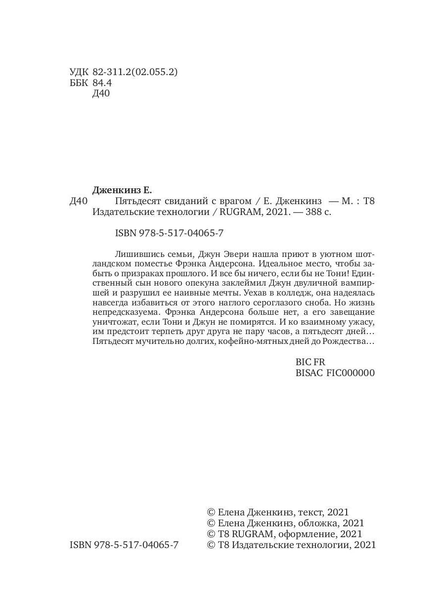Handling time: 19 days Автор: Дженкинз Елена, «Пятьдесят свиданий с врагом»: Лишившись семьи, Джун Эвери нашла приют в уютном шотландском поместье Фрэнка Андерсона. Идеальное место, чтобы забыть о призраках прошлого. И все бы ничего, если бы не Тони! Единственный сын нового опекуна заклеймил Джун двуличной вампиршей и разрушил ее наивные мечты. Уехав в колледж, она надеялась навсегда избавиться от этого наглого сероглазого сноба. Но жизнь непредсказуема. Фрэнка Андерсона больше нет, а его завещание уничтожат, если Тони и Джун не помирятся. И ко взаимному ужасу, им предстоит терпеть друг друга не пару часов, а пятьдесят дней… Пятьдесят мучительно долгих, кофейно-мятных дней до Рождества…