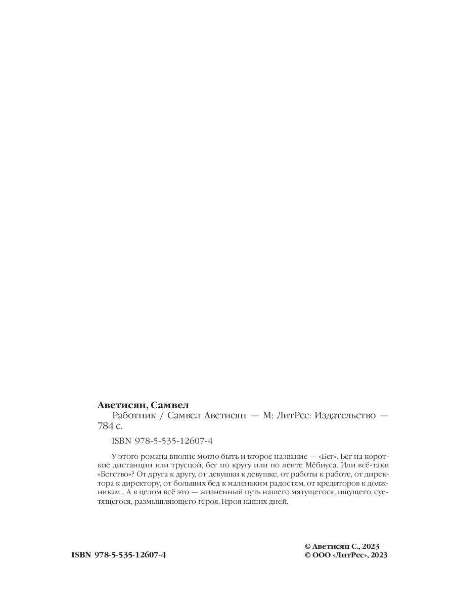 Handling time: 19 days Автор: Аветисян С., «Работник»: У этого романа вполне могло быть и второе название - "Бег". Бег на короткие дистанции или трусцой, бег по кругу или по ленте Мёбиуса. Или всё-таки "Бегство"? От друга к другу, от девушки к девушке, от работы к работе, от директора к директору, от больших бед к маленьким радостям, от кредиторов к должникам… А в целом всё это - жизненный путь нашего мятущегося, ищущего, суетящегося, размышляющего героя. Героя наших дней.