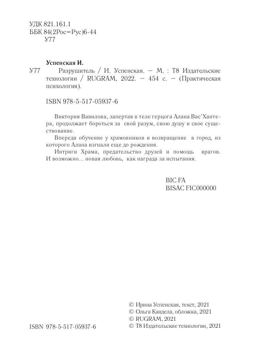 Handling time: 19 days Автор: Успенская Ирина, «Разрушитель»: Виктория Вавилова, запертая в теле герцога Алана Вас'Хантера, продолжает бороться за свой разум, свою душу и свое существование.