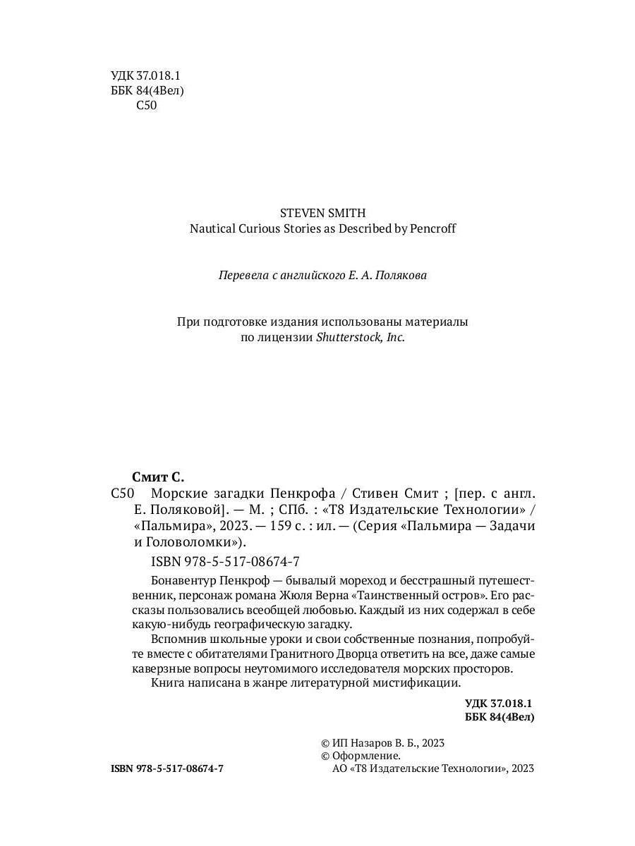 Handling time: 19 days Автор: Смит С., «Морские загадки Пенкрофа»: Долгими зимними вечерами, уютно расположившись перед камином, пятеро друзей, отважных жителей Таинственного острова, вели бесконечные и увлекательные беседы. О чем? Да обо всем на свете! Всеобщей любовью пользовались потрясающе интересные воспоминания Бонавентура Пенкрофа - бывалого морехода и бесстрашного путешественника. Его рассказы были не совсем обычны. Каждый из них содержал в себе какую-либо географическую загадку. Как образуются атоллы? Можно ли ловить рыбу на суше? Где находится море, в котором нельзя утонуть? Есть ли льды на экваторе? Откуда берутся исполинские волны?.. Попробуйте вместе с обитателями Гранитного Дворца ответить на все, даже самые каверзные вопросы неутомимого исследователя морских просторов.