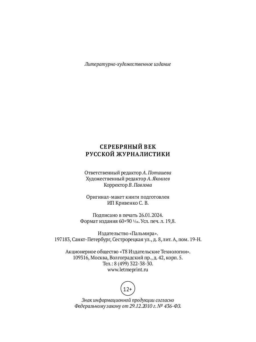 Handling time: 19 days «Серебряный век русской журналистики: сборник»: В настоящем издании публикуются эталонные образцы русской публицистики начала ХХ столетия - очерки, статьи, рассказы и фельетоны таких классиков газетного жанра, как В. Дорошевич, А. Амфитеатров, А. Аверченко, А. Измайлов и др. Лаконичные, меткие, злободневные, эти тексты и сегодня не утратили силы воздействия и способности возбуждать интерес читающей публики.
