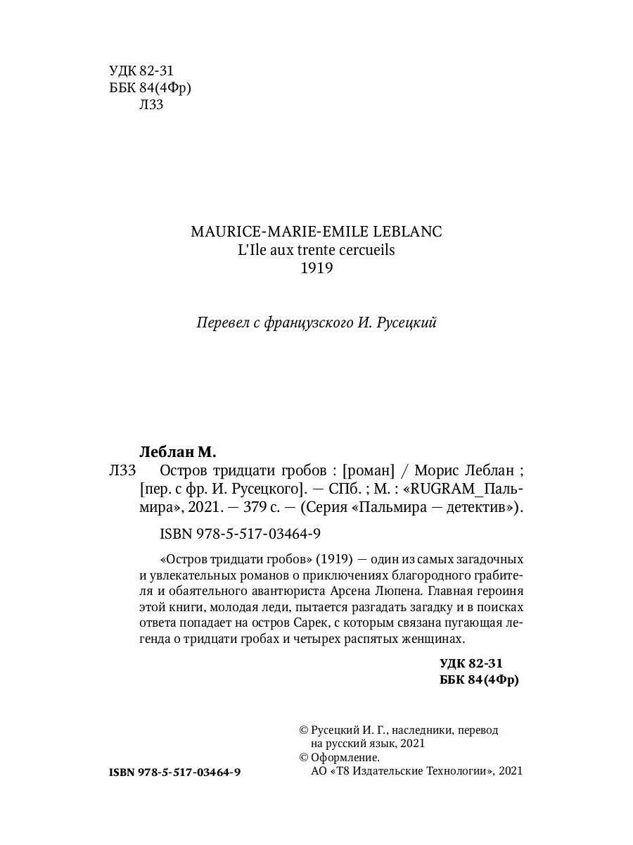 Handling time: 19 days Автор: Леблан Морис, «Остров тридцати гробов»: «Остров тридцати гробов» (Леблан Морис) — один из самых загадочных и увлекательных романов о приключениях благородного грабителя и обаятельного авантюриста Арсена Люпена. Главная героиня этой книги, молодая леди, пытается разгадать загадку и в поисках ответа попадает на остров Сарек, с которым связана пугающая легенда о тридцати гробах и четырех распятых женщинах.