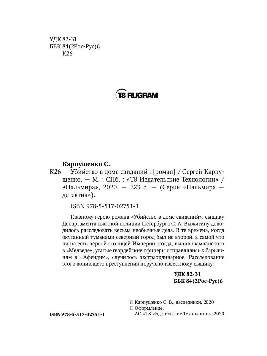 #ASTTD# Search Terms: Карпущенко С.В. , Karpyshenko S.V. , М.; СПб.: "Т8 Издательские технологии"/ "Пальмира" , M.; SPb.: "T8 Izdatelskie tehnologii"/ "Palmira" , Пальмира - Детектив , Palmira - Detektiv , 9785517027511 , 978-5-517-02751-1 , 1611263