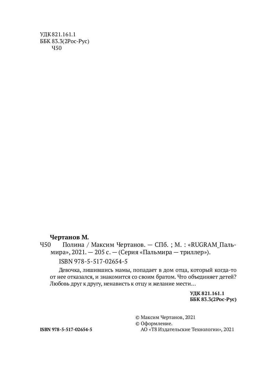 #ASTTD# Search Terms: Чертанов М. , Chertanov M. , СПб. ; М. : "RUGRAM_Пальмира" , SPb. ; M. : "RUGRAM_Palmira" , Пальмира - триллер , Palmira - triller , 9785517026545 , 978-5-517-02654-5 , 1734707