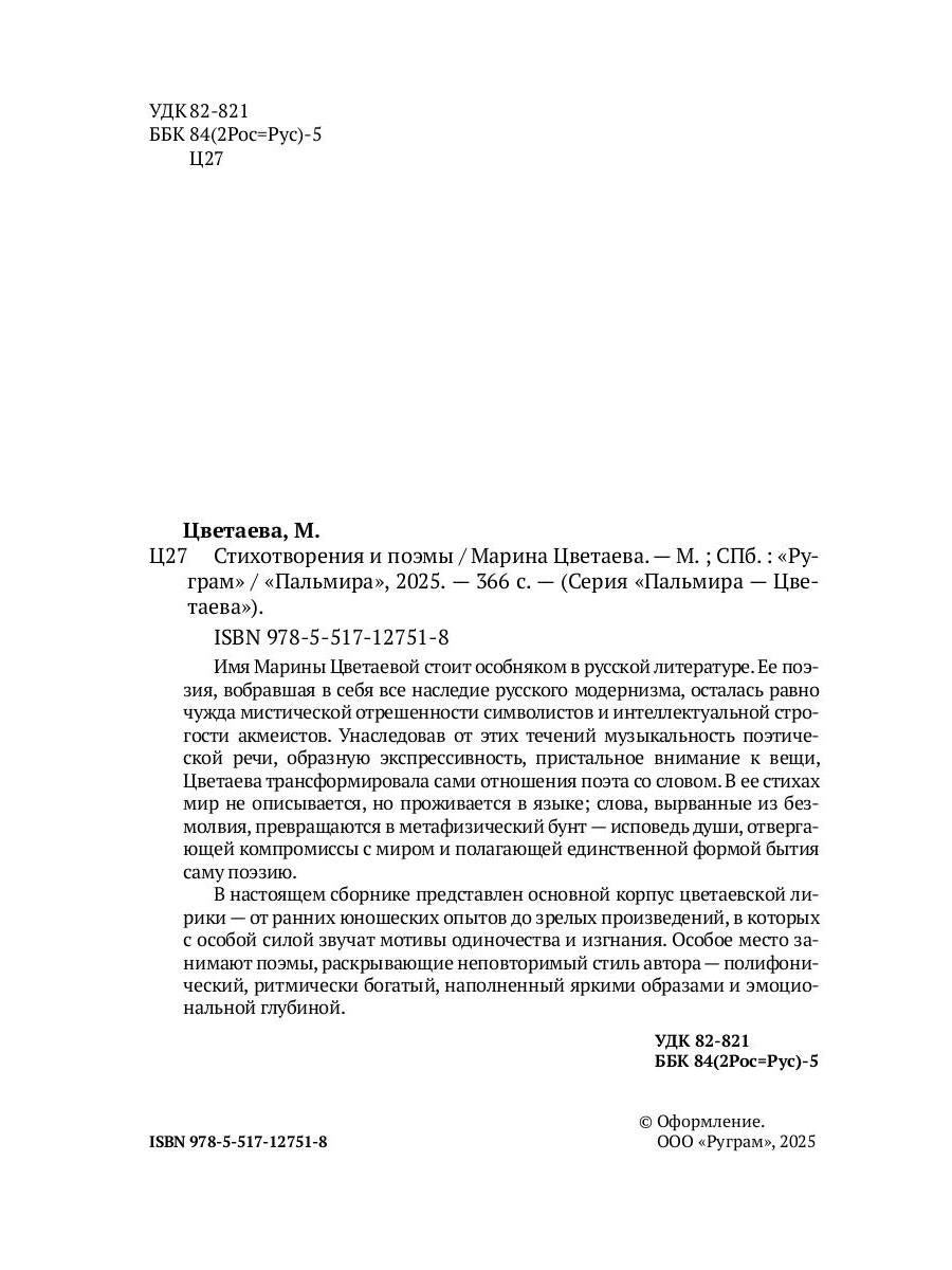 #ASTTD# Search Terms: Цветаева М.И. , Cvetaeva M.I. , Пальмира , Т8 RUGRAM , Palmira , T8 RUGRAM , Пальмира - Цветаева , Palmira - Cvetaeva , 9785517127518 , 978-5-517-12751-8 , 2128811