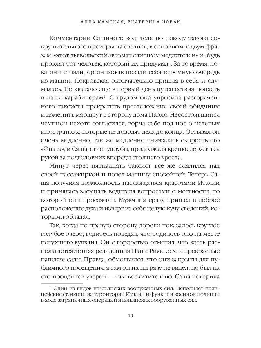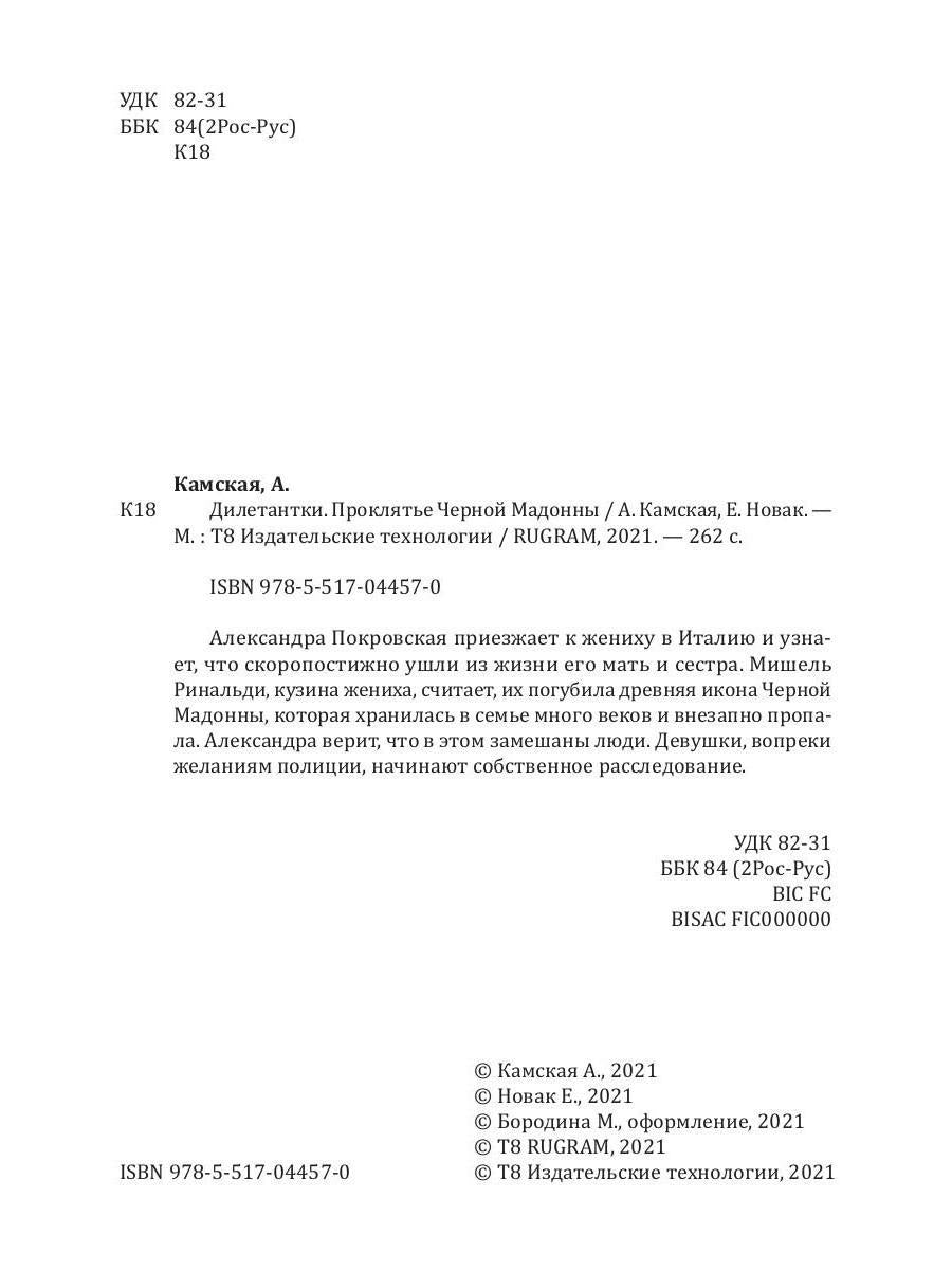 Handling time: 19 days Александра Покровская приезжает к жениху в Италию и узнает, что скоропостижно ушли из жизни его мать и сестра. Мишель Ринальди, кузина жениха, считает, их погубила древняя икона Черной Мадонны, которая хранилась в семье много веков и внезапно пропала. Александра верит, что в этом замешаны люди. Девушки, вопреки желаниям полиции, начинают собственное расследование. Шесть причин купить 1Легкий детектив про двух авантюристок, которые из неприятелей превратились в закадычных подруг. 2Любителям семейных тайн и старых скелетов в шкафу посвящается. 3История о коварстве и предательстве, о борьбе за наследство и о зловредных родственниках, мечтающих отобрать виллу на озере Альбано и красную «Мазерати». 4О соле мио, или как объехать всю Италию за 262 страницы. Верона, Венеция, Флоренция, Сорренто и, конечно же, Рим - вот ваши остановки на протяжении повествования. 5Путешествуйте на трамджазе, побывайте в подземельях Ватикана, сходите на шопинг в самые модные бутики вместе с героинями этого романа. 6Верите в истории о проклятых вещицах? А в то, что они могут оставлять за собой кровавый след? Читайте книгу, чтобы составить свое мнение. Только помните, что не все герои могут дожить до финала!