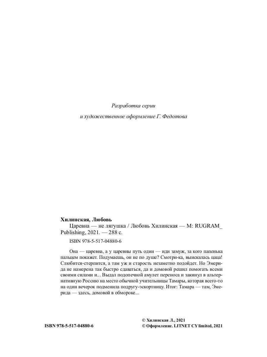 Handling time: 19 days Она - царевна, а у царевны путь один - иди замуж, на кого папенька пальцем покажет. И что, что он не по душе? Смотри-ка, выискалась цаца! Слюбится-стерпится, а там уж и старость незаметно подойдет. Но Эмерида не намерена так быстро сдаваться, да и домовой решил помогать всеми своими силами и... Выдал подопечной амулет переноса и закинул в альтернативную Россию на место обычной учител ьницы Тамары, которая всего-то на один вечерок подменила подругу-эскортницу. Итог - Тамара - там, Эмерида - здесь, домовой в обмороке... Пять причин купить 1Под обложкой: любовь-морковь, страсть, эротика, юмор. 2А также альтернативная Россия. 3В довесок – перемещения между мирами и превращение царевны в учительницу. 4Правда, в не совсем обычной ипостаси 5В общем, романтико-юмористическое фэнтези.