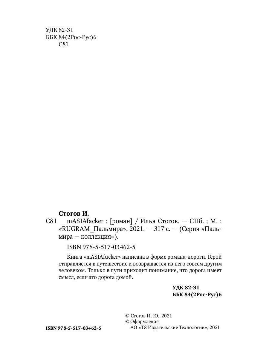 Handling time: 14 days Автор: Стогов Илья, «mASIAfacker»: Книга «mASIAfucker» написана в форме романа-дороги. Герой отправляется в путешествие и возвращается из него совсем другим человеком. Только в пути приходит понимание, что дорога имеет смысл, если это дорога домой.