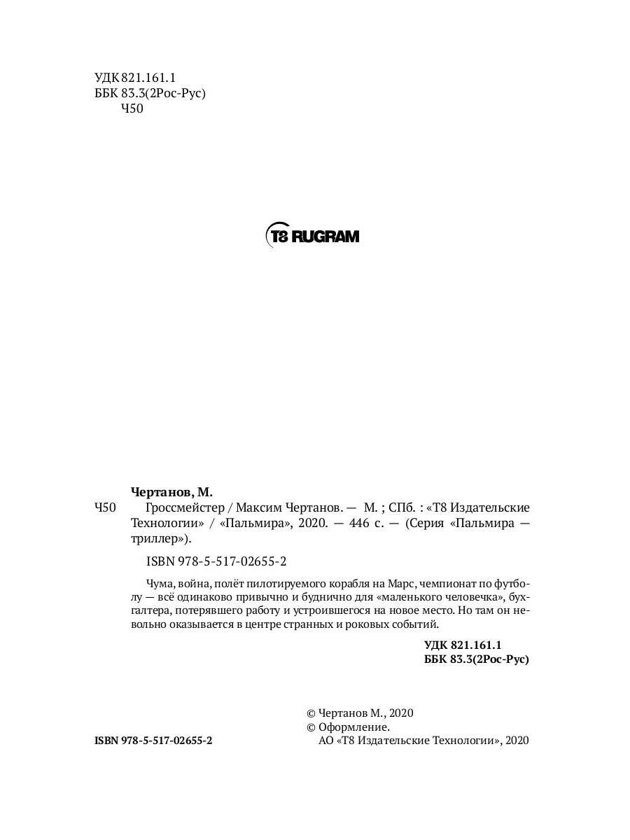 #ASTTD# Search Terms: Чертанов М. , Chertanov M. , М.; СПб.: "Т8 Издательские технологии"/ "Пальмира" , M.; SPb.: "T8 Izdatelskie tehnologii"/ "Palmira" , Пальмира - триллер , Palmira - triller , 9785517026552 , 978-5-517-02655-2 , 1608159