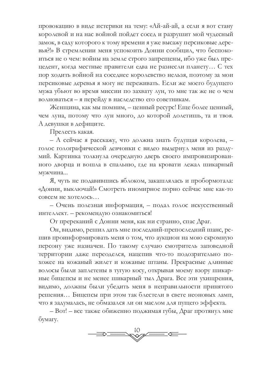 Handling time: 19 days Автор: Черчень Александра, «Счастливый брак по-космически»: Тарнилоун — торговая столица планеты, нейтральная территория и город, привлекающий ежегодно огромное количество гостей. А все из-за важнейшего события — аукциона невест. Здесь меня и продадут. Дорого, очень дорого, но вовсе не из-за того, что я умна, или хороша собой. Дело в том, что здесь, вне Земли, любая женщина на вес золота. Моя стартовая цена — 780 000 кредитов. Неприятно чувствовать себя товаром, пусть и очень дорогим. И местным очень скоро предстоит узнать, что если русская женщина не хочет замуж, то она туда не пойдет!