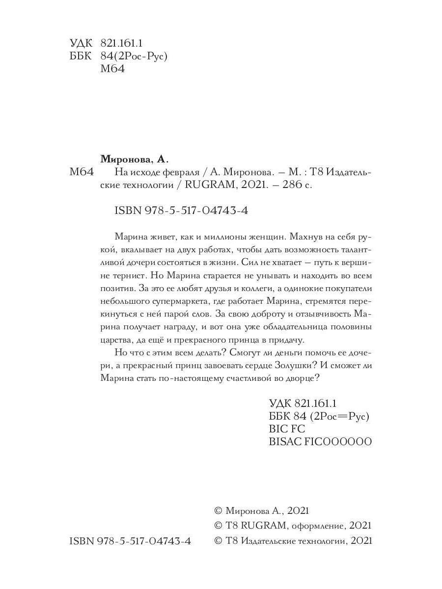 Handling time: 19 days Автор: Миронова Александра, «На исходе февраля»: Марина живет, как и миллионы женщин. Махнув на себя рукой, вкалывает на двух работах, чтобы дать возможность талантливой дочери состояться в жизни. Сил не хватает — путь к вершине тернист. Но Марина старается не унывать и находить во всем позитив. За это ее любят друзья и коллеги, а одинокие покупатели небольшого супермаркета, где работает Марина, стремятся перекинуться с ней парой слов. За свою доброту и отзывчивость Марина получает награду, и вот она уже обладательница половины царства, да ещё и прекрасного принца в придачу.