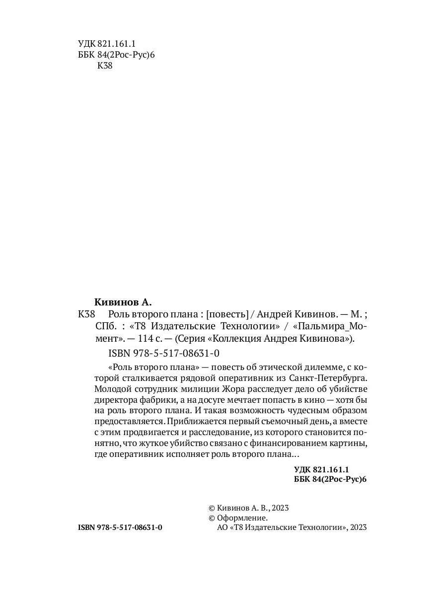 Handling time: 19 days Автор: Кивинов Андрей, «Роль второго плана»: Андрей Кивинов — российский писатель, создатель героев и сюжетов, на долгие годы сформировавших образ сотрудников полиции в постсоветской России. Сериалы «Улицы разбитых фонарей» и «Убойная сила» основаны на романах Андрея Кивинова, а сам писатель в 1990-е годы занимал должность начальника отдела по раскрытию умышленных убийств в Санкт-Петербурге. Сегодня — подполковник милиции в отставке, писатель и сценарист. «Роль второго плана» — повесть об этической дилемме, с которой сталкивается рядовой оперативник из Санкт-Петербурга. Молодой сотрудник милиции Жора расследует дело об убийстве директора фабрики, а на досуге мечтает попасть в кино — хотя бы на роль второго плана. И такая возможность чудесным образом предоставляется. Приближается первый съемочный день, а вместе с этим продвигается и расследование, из которого становится понято, что жуткое убийство связано с финансированием картины, где оперативник исполняет роль второго плана...