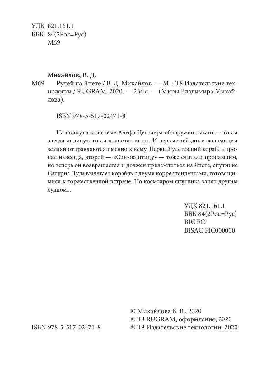 Handling time: 19 days Автор: Михайлов Владимир, «Ручей на Япете»: На полпути к системе Альфа Центавра обнаружен лигант — то ли звезда-лилипут, то ли планета-гигант. И первые звёздные экспедиции землян отправляются именно к нему. Первый улетевший корабль пропал навсегда, второй — «Синюю птицу» — тоже считали пропавшим, но теперь он возвращается и должен приземлиться на Япете, спутнике Сатурна. Туда вылетает корабль с двумя корреспондентами, готовящимися к торжественной встрече. Но космодром спутника занят другим судном...