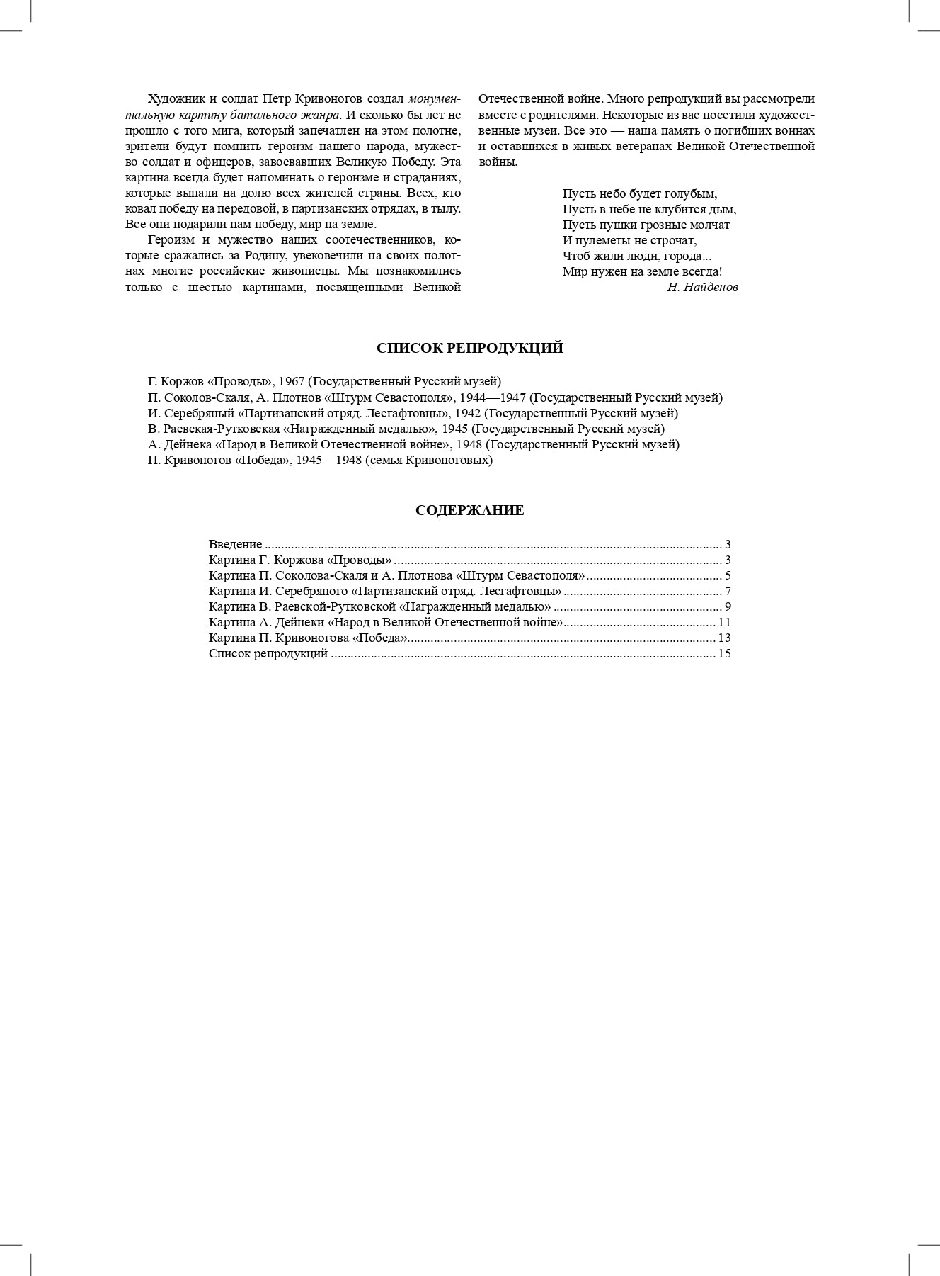 Handling time: 19 days Данное пособие по ознакомлению дошкольников с картинами о Великой Отечественной войне включает шесть конспектов и репродукций, которые позволят детям получить первоначальные знания, способствующие формированию гражданской позиции и патриотического взгляда на историю нашего Отечества. Культурологическая составляющая цикла дает возможность познакомить детей с разными жанрами произведений о войне: двойной и групповой портрет, бытовой, батальный, исторический жанр, с монументальностью и плакатностью в живописи. Пособие может быть рекомендовано педагогам дошкольных учреждений, родителям и гувернерам, студентам педагогических учебных заведений. Перечень репродукций: Г. М. Коржов. ПРОВОДЫ (1967 г.), П. П. Соколов-Скаля, А. Плотнов. ШТУРМ СЕВАСТОПОЛЯ (1944—1947 г.), И. А. Серебряный. ПАРТИЗАНСКИЙ ОТРЯД. ЛЕСГАФТОВЦЫ (1942 г.), В. А. Раевская-Рутковская. НАГРАЖДЕННЫЙ МЕДАЛЬЮ (1945 г.), А. А. Дейнека. НАРОД В ВЕЛИКОЙ ОТЕЧЕСТВЕННОЙ ВОЙНЕ (1948 г.), П. Кривоногов. ПОБЕДА (1945—1948 г.).