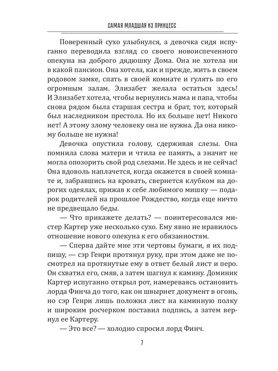 Handling time: 19 days Автор: Завгородняя Анна, «Самая младшая из принцесс»: Окончив обучение в пансионе для юных дам, принцесса Элизабет Каррингтон, по завещанию своей матери, вынуждена отправится жить до совершеннолетия в старый замок своего опекуна, лорда Генри Финча, человека загадочного и мрачного. Но оказавшись в Каслроке девушка узнает, что замок хранит в себе много тайн, которые ей не терпится разгадать. В погоне за ними, Элизе предстоит не только раскрыть тайну замка и его хозяина, но также узнать, кто много лет назад уничтожил ее семью, оставив Элизу сиротой.