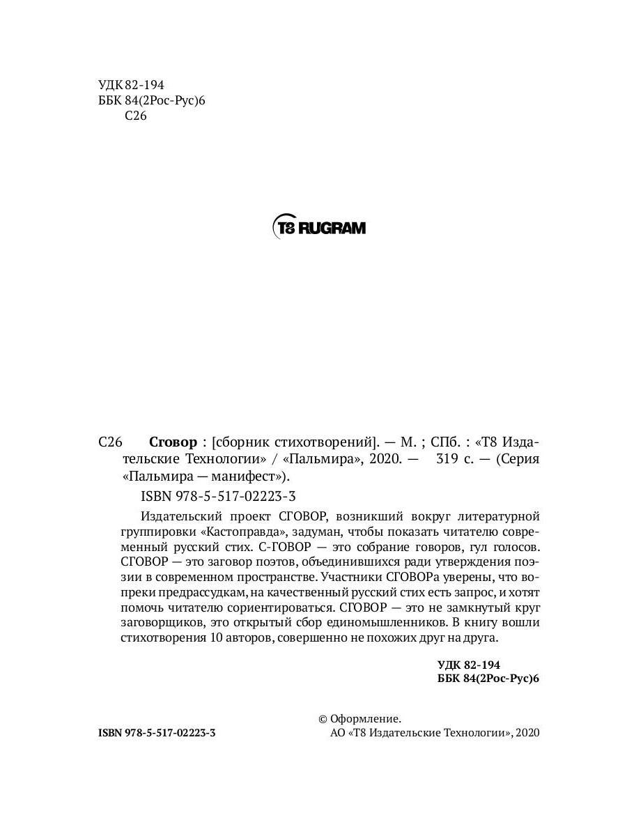 Handling time: 19 days «Сговор: сборник стихотворений»: Издательский проект СГОВОР, возникший вокруг литературной группировки «Кастоправда», задуман, чтобы показать читателю современный русский стих. С-ГОВОР — это собрание говоров, гул голосов. СГОВОР — это заговор поэтов, объединившихся ради утверждения поэзии в современном пространстве. Участники СГОВОРа уверены, что вопреки предрассудкам, на качественный русский стих есть запрос, и хотят помочь читателю сориентироваться. СГОВОР — это не замкнутый круг заговорщиков, это открытый сбор единомышленников. В книгу вошли стихотворения 10 авторов, совершенно не похожих друг на друга.