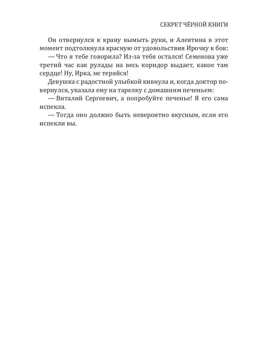 Handling time: 19 days Автор: Калинина Наталья, «Секрет черной книги»: Казалось, ничто не может разрушить мирное существование провинциального дома престарелых, куда Вера устроилась на работу медсестрой, ища себе убежище. Но смерть старушки и оставленное ею наследство взбудоражили старинную усадьбу и перевернули все с ног на голову. Вере угрожают, хотя девушка и сама не понимает, что именно ищут преследователи. И как раз в этот момент в ее жизни появляется странный незнакомец — еще один враг? Или друг?