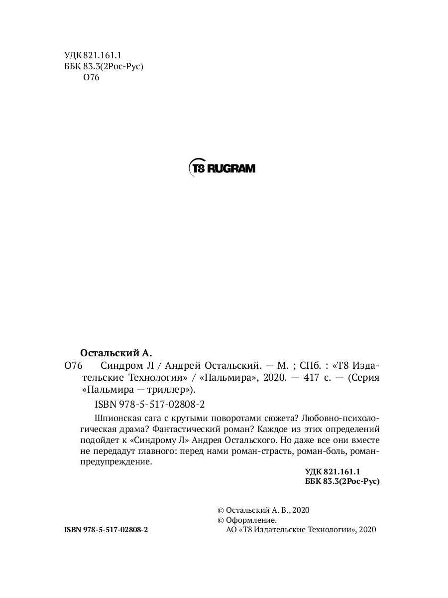 Handling time: 19 days Автор: Остальский Андрей, «Синдром Л»: Шпионская сага с крутыми поворотами сюжета? Любовно-психологическая драма? Фантастический роман? Каждое из этих определений подойдет к «Синдрому Л» Андрея Остальского. Но даже все они вместе не передадут главного: перед нами роман-страсть, роман-боль, роман-предупреждение.