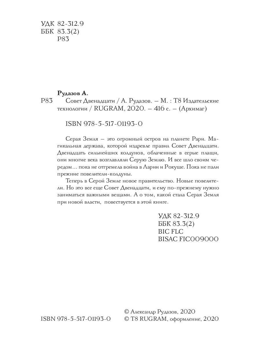 Handling time: 19 days Автор: Рудазов Александр, «Совет Двенадцати»: Серая Земля — это огромный остров на планете Рари. Магикальная держава, которой издревле правил Совет Двенадцати. Двенадцать сильнейших колдунов, облаченные в серые плащи, они многие века возглавляли Серую Землю. И все шло своим чередом.. . пока не отгремела война в Ларии и Рокуше. Пока не пали прежние повелители-колдуны. Теперь в Серой Земле новое правительство. Новые повелители. Но это все еще Совет Двенадцати, и ему по-прежнему нужно заниматься важными вещами. А о том, какой стала Серая Земля при новой власти, повествуется в этой книге.