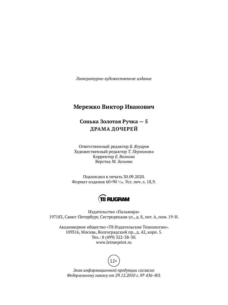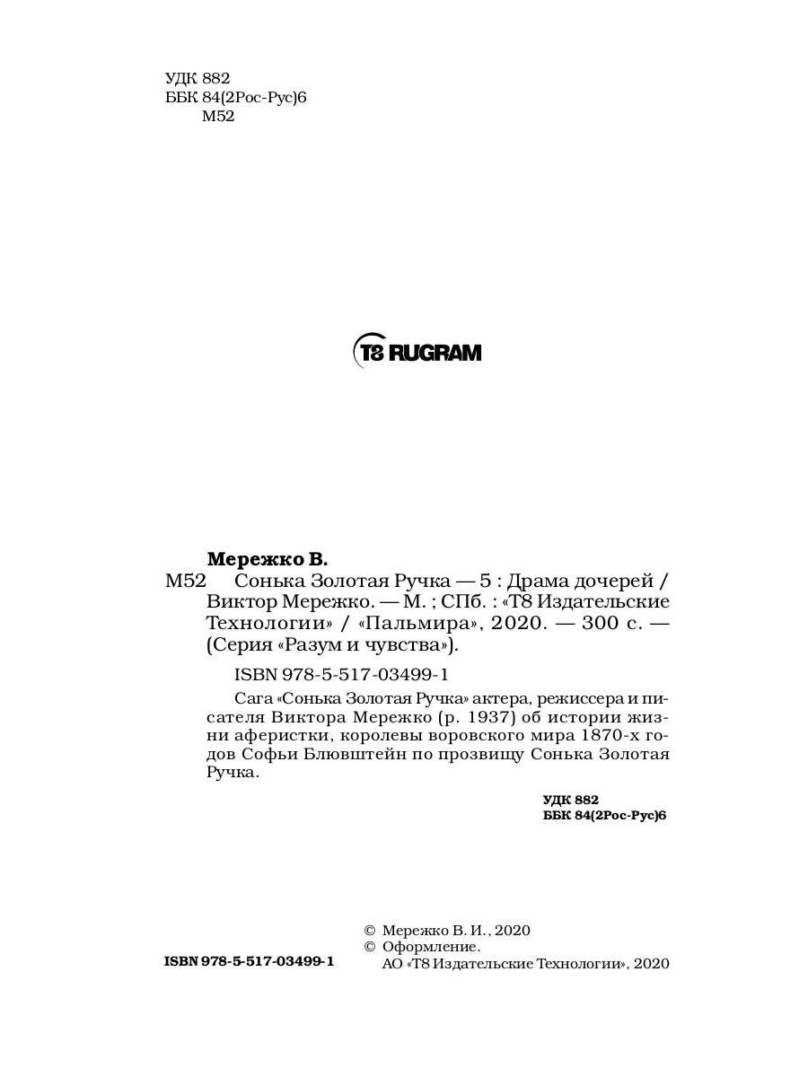 Handling time: 19 days Автор: Мережко Виктор, «Сонька Золотая Ручка — 5. Драма дочерей»: Сага «Сонька Золотая Ручка» актера, режиссера и писателя Виктора Мережко (1937–2022) об истории жизни аферистки, королевы воровского мира 1870-х годов Софьи Блювштейн по прозвищу Сонька Золотая Ручка.