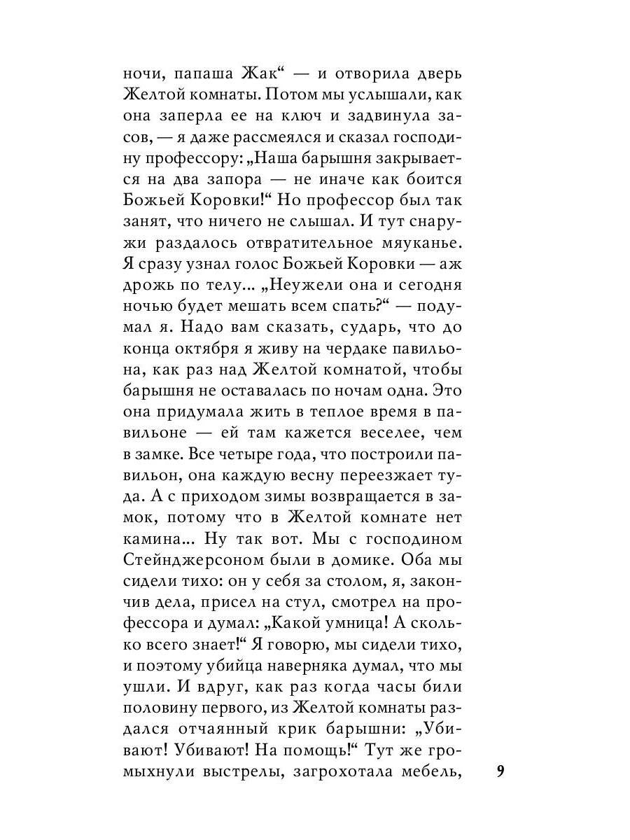 Handling time: 19 days Автор: Леру Гастон, «Тайна желтой комнаты»: Роман «Тайна желтой комнаты» (1907) — классический психологический детектив. Действие происходит в старинном замке, где опытный преступник покушается на жизнь хозяйки замка. Страшное преступление, совершенное в запертой комнате в замке Гландье близ Парижа, раскрывает молодой репортер газеты. Это первый роман Г. Леру о приключениях Рультабия, положивший начало целому направлению в детективной литературе. Прочитав его, юная Агата Кристи приняла решение заняться сочинением детективов.