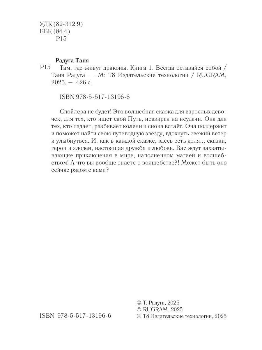 Handling time: 19 days Автор: Радуга Т., «Там, где живут драконы. Кн. 1: Всегда оставайся собой»: Спойлера не будет. Это волшебная сказка для взрослых девочек, для тех, кто ищет свой Путь, невзирая на неудачи. Она для тех, кто падает, разбивает колени и снова встаёт. Она поддержит и поможет найти свою путеводную звезду, вдохнуть свежий ветер и улыбнуться. И, как в каждой сказке, здесь есть доля... сказки, герои и злодеи, настоящая дружба и любовь. Вас ждут захватывающие приключения в мире, наполненном магией и волшебством! А что вы вообще знаете о волшебстве? Может быть оно сейчас рядом с вами?