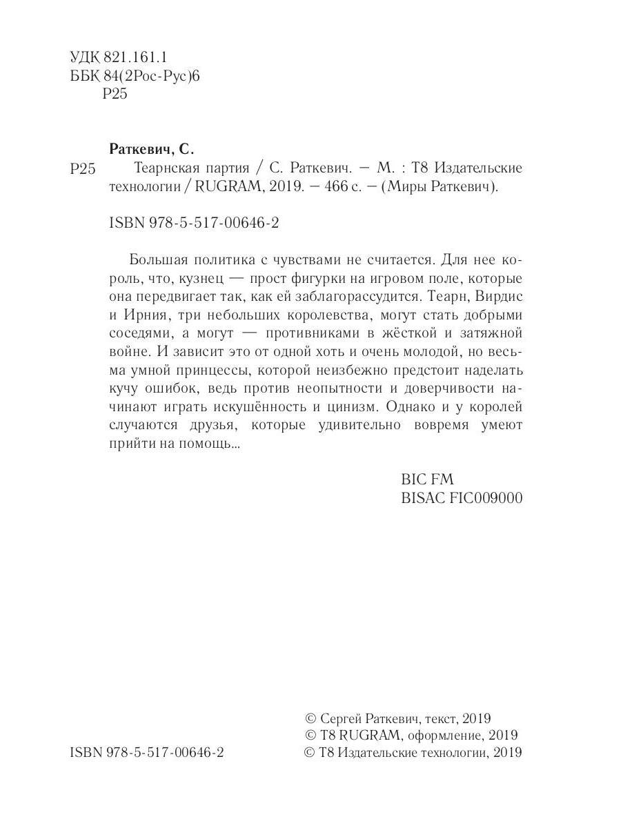 Handling time: 19 days Автор: Раткевич С., «Теарнская партия»: Большая политика с чувствами не считается. Для нее король, что, кузнец — прост фигурки на игровом поле, которые она передвигает так, как ей заблагорассудится. Теарн, Вирдис и Ирния, три небольших королевства, могут стать добрыми соседями, а могут — противниками в жёсткой и затяжной войне. И зависит это от одной хоть и очень молодой, но весьма умной принцессы, которой неизбежно предстоит наделать кучу ошибок, ведь против неопытности и доверчивости начинают играть искушённость и цинизм. Однако и у королей случаются друзья, которые удивительно вовремя умеют прийти на помощь...