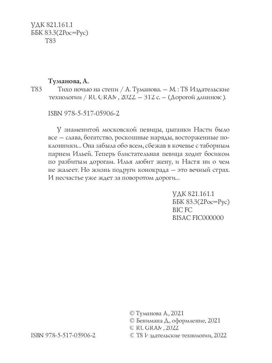 Handling time: 19 days Автор: Туманова Анастасия, «Тихо ночью на степи»: У знаменитой московской певицы, цыганки Насти было все – слава, богатство, роскошные наряды, восторженные поклонники… Она забыла обо всем, сбежав в кочевье с таборным парнем Ильей. Теперь блистательная певица ходит босиком по разбитым дорогам. Илья любит жену, и Настя ни о чем не жалеет. Но жизнь подруги конокрада – это вечный страх. И несчастье уже ждет за поворотом дороги…