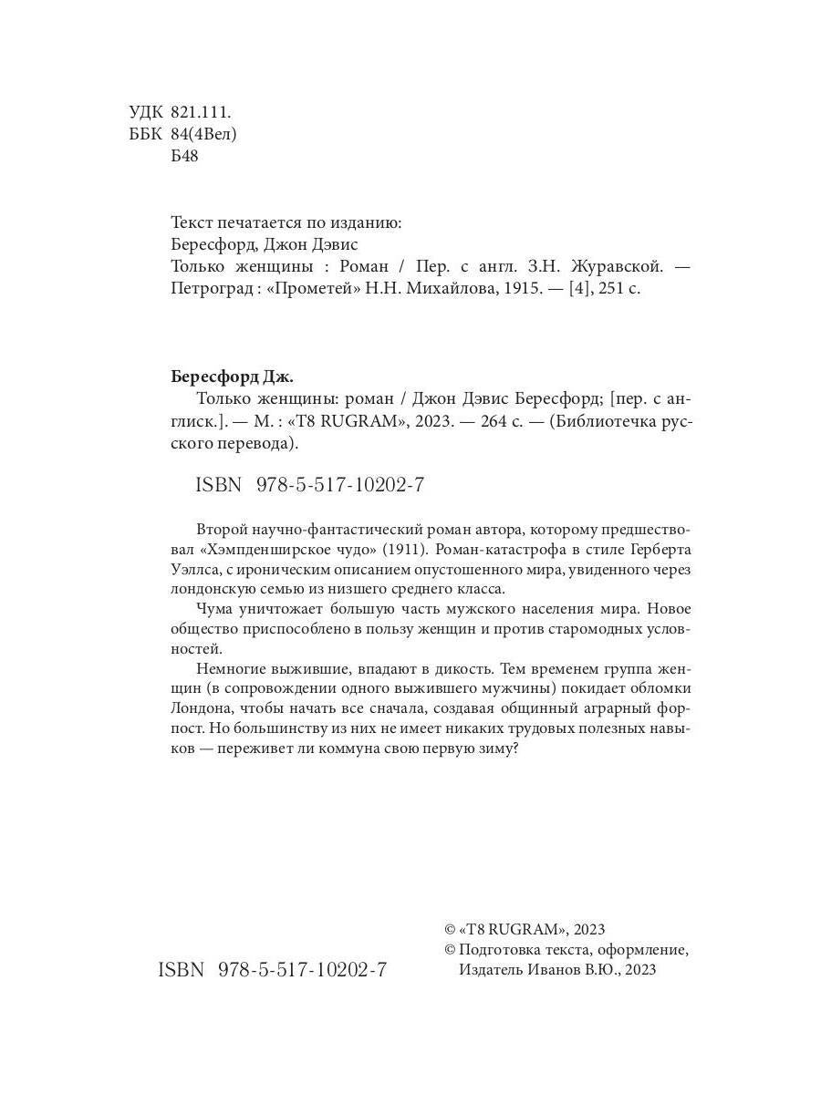 Handling time: 19 days Автор: Бересфорд Дж., «Только женщины: роман»: Второй научно-фантастический роман автора, которому предшествовал «Хэмпденширское чудо» (1911). Роман-катастрофа в стиле Герберта Уэллса, с ироническим описанием опустошенного мира, увиденного через лондонскую семью из низшего среднего класса. Чума уничтожает большую часть мужского населения мира. Новое общество приспособлено в пользу женщин и против старомодных условностей. Немногие выжившие впадают в дикость. Тем временем группа женщин (в сопровождении одного выжившего мужчины) покидает обломки Лондона, чтобы начать все сначала, создавая общинный аграрный форпост. Но большинство из них не имеет никаких трудовых полезных навыков - переживет ли коммуна свою первую зиму?