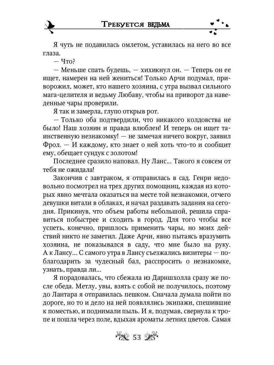 Handling time: 19 days Автор: Шерстобитова Ольга, «Требуется ведьма»: Что делать, если ты потеряла работу? Конечно же, найти другую! И не беда, что хозяин Дарншхолла, куда я устроилась помощницей садовника, магов на дух не переносит! Подумаешь… Я и не маг. Всего лишь… ведьма. И, увы, со всеми вытекающими из этого последствиями. И характер такой, что зубы можно об него сломать, и экспериментировать с зельями и заклинаниями очень даже люблю, и от недостатка фантазии не страдаю. А вот от чего совсем страдаю, так от собственного любопытства! Иначе бы, к примеру, я точно не стала выяснять, почему проклят хозяин Дарншхолла, не полезла бы в чужие тайны и… не влюбилась бы! И теперь все перевернулось с ног на голову, даже собственная магия не слушается, я только успеваю разгонять претенденток на сердце суженого, а моя метелка так вообще… занялась сводничеством! Говорите, вам точно не требуется ведьма? А вы уверены?
