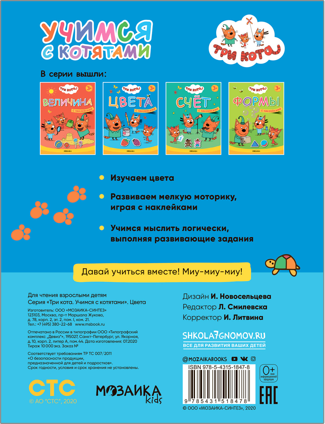Handling time: 19 days Цвета (Три кота. Учимся с котятами), книжка с наклейками Книга «Цвета» серии «Три кота. Учимся с котятами» — это не только увлекательная книга с наклейками, но и отличный способ закрепить знания, развить мелкую моторику, логику и внимание. Вместе с тремя котятами ребенок познакомится с основными цветами: красным, желтым, зеленым, синим и оранжевым. На каждой странице его ждут задания на изучение того или иного цвета. Внизу страницы — забавные нелепицы, в которых нужно исправить ошибку. А в конце книги — задания для самопроверки. И все это с наклейками....