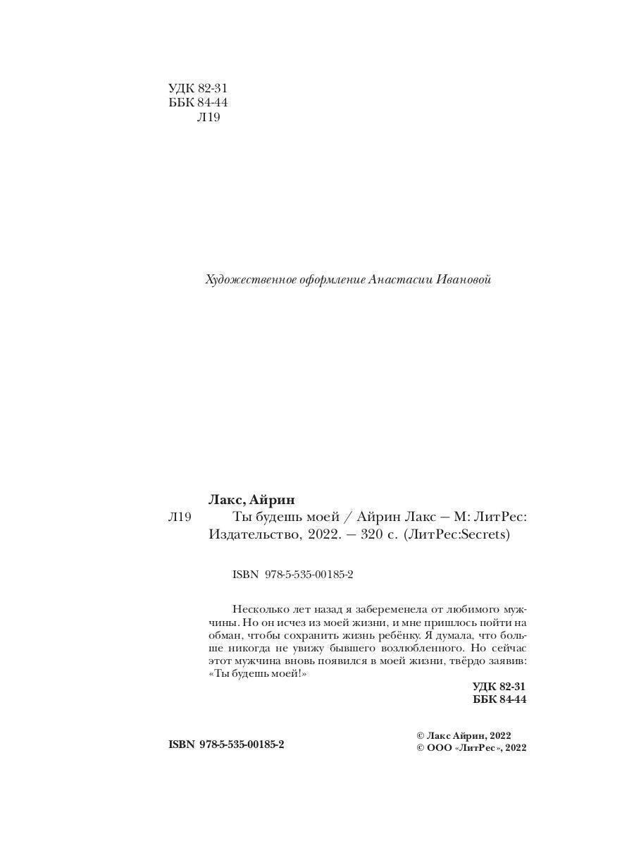 Handling time: 19 days Автор: Лакс Айрин, «Ты будешь моей»: Несколько лет назад я забеременела от любимого мужчины. Но он исчез из моей жизни, и мне пришлось пойти на обман, чтобы сохранить жизнь ребёнку. Я думала, что больше никогда не увижу бывшего возлюбленного. Но сейчас этот мужчина вновь появился в моей жизни, твёрдо заявив: «Ты будешь моей!»