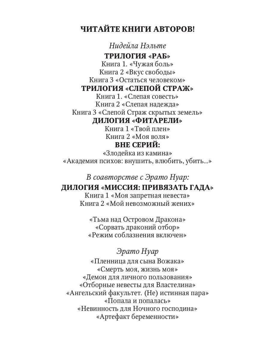 Handling time: 19 days Авторы: Нэльте Нидейла, Нуар Эрато, «Тьма над Островом Дракона»: Брачный договор — западня, расставленная королём и его придворным магом. Арелис надеется избежать этой участи, но неожиданно вспыхнувшая страсть захлопывает страшную ловушку. Теперь ей нужно спасти одного оборотня, снять драконье проклятье, сразиться с самой Тьмой и... справиться с несчастной любовью. Что из этого выйдет? Ведь будущее непредсказуемо, а самый страшный демон уже вырвался на свободу...