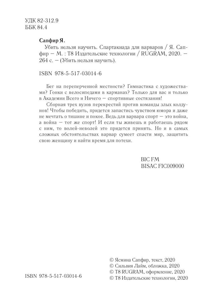 Handling time: 19 days Автор: Сапфир Ясмина, «Убить нельзя научить. Спартакиада для варваров»: Бег на переперченной местности? Гимнастика с художествами? Гонки с велосипедами в карманах? Только для вас и только в Академии Всего и Ничего — спортивные состязания! Сборная трех вузов перекрестий против команды злых колдунов! Чтобы победить, придется запастись чувством юмора и даже не мечтать о тишине и покое. Ведь для варвара спорт — это война, а война - тот же спорт! И если ты живешь и работаешь рядом с ним, то волей-неволей это придется принять. Но и в самых сложных обстоятельствах варвар сумеет спасти мир, защитить свою женщину и найти время для потехи.