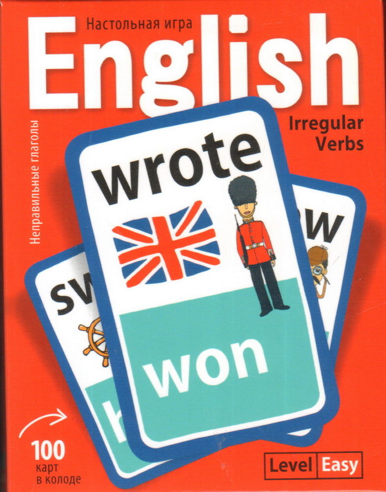 Handling time: 19 days Взгляните на изучение глаголов по-новому вместе с "English Irregular Verbs". Это набор увлекательных игр для запоминания английских неправильных глаголов и причастий. Он поможет избежать нудной зубрежки и разнообразить учебный процесс.English Irregular Verbs - это целых 6 необычных весёлых игр в слова для 2-15 человек, с их помощью английские глаголы запоминаются легко и быстро. Выкладывайте карты на стол, соединяя разные формы глаголов, рассказывайте короткие истории и проверяйте знания друг друга. Игры помогают запомнить правописание и расширить лексический запас. Они эффективно дополняют школьную программу и помогают в игровой форме закрепить пройденный материал."Гадание на глаголах", "Пантомима", "Счастливая тройка" и ещё 3 интересных игры. В English Irregular Verbs можно играть всей учебной группой прямо на занятиях или дома. Игра разработана специально для учителей английского языка, школьников и родителей.+ 100 карт в колоде.+ 6 интересных игр.+ Запоминающиеся образы.Число игроков от 2 до 15.Возраст 9+.Рекомендуемое время игры 25 минут.