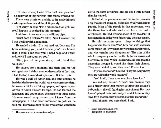 Handling time: 34 days 1914 год, Европа стоит на пороге Первой мировой войны. Инженер Ричард Ханней возвращается из Африки в старую добрую Англию, где ведёт размеренную холостяцкую жизнь. Однажды некий сосед Ричарда просит у него помощи, утверждая, что ему грозит смертельная опасность, поскольку он напал на след шпионской организации, собирающейся похитить военные секреты Великобритании. Скучающий Ричард соглашается помочь незнакомцу и поневоле оказывается втянутым в шпионские игры. Вскоре Ричарда начинают преследовать не только агенты иностранной разведки, но и полиция - за убийство, которого он не совершал. Теперь судьба страны зависит от того, успеет ли он разгадать тайный шифр и разоблачить коварный план врагов. Произведение написано в жанре шпионского триллера и экранизировано четыре раза, в том числе и знаменитым Альфредом Хичкоком.В книгу также вошли три рассказа Джона Бакена.Текст сокращён и адаптирован. Уровень А2.Адаптация, сокращение и словарь: А.В. Шитова.