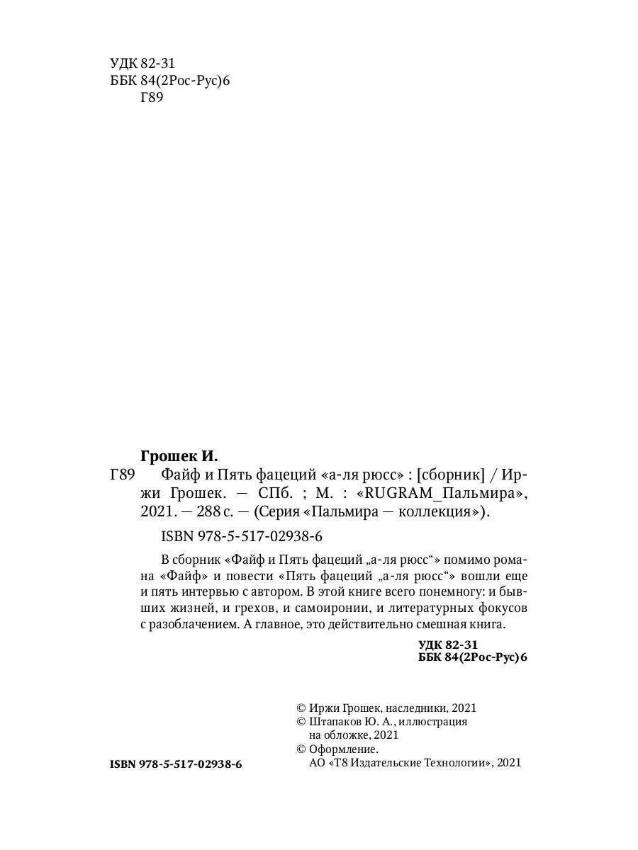 Handling time: 19 days Автор: Грошек Иржи, «Файф и Пять фацеций "а-ля рюсс"»: В сборник «Файф и Пять фацеций „а-ля рюсс"» помимо романа «Файф» и повести «Пять фацеций „а-ля рюсс"» вошли еще и пять интервью с автором. В этой книге всего понемногу: и бывших жизней, и грехов, и самоиронии, и литературных фокусов с разоблачением. А главное, это действительно смешная книга.