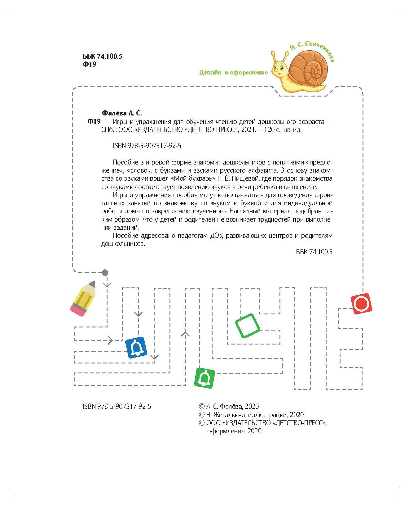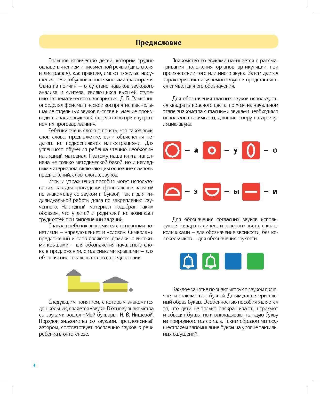 Handling time: 19 days Пособие в игровой форме знакомит дошкольников с понятиями «предложение», «слово», с буквами и звуками русского алфавита. В основу знакомства со звуками вошел «Мой букварь» Н. В. Нищевой, где порядок знакомства со звуками соответствует появлению звуков в речи ребенка в онтогенезе. Игры и упражнения пособия могут использоваться для проведения фронтальных занятий по знакомству со звуком и буквой и для индивидуальной работы дома по закреплению изученного. Наглядный материал подобран таким образом, что у детей и родителей не возникает трудностей при выполнении заданий. Пособие адресовано педагогам ДОУ, развивающих центров и родителям дошкольников.