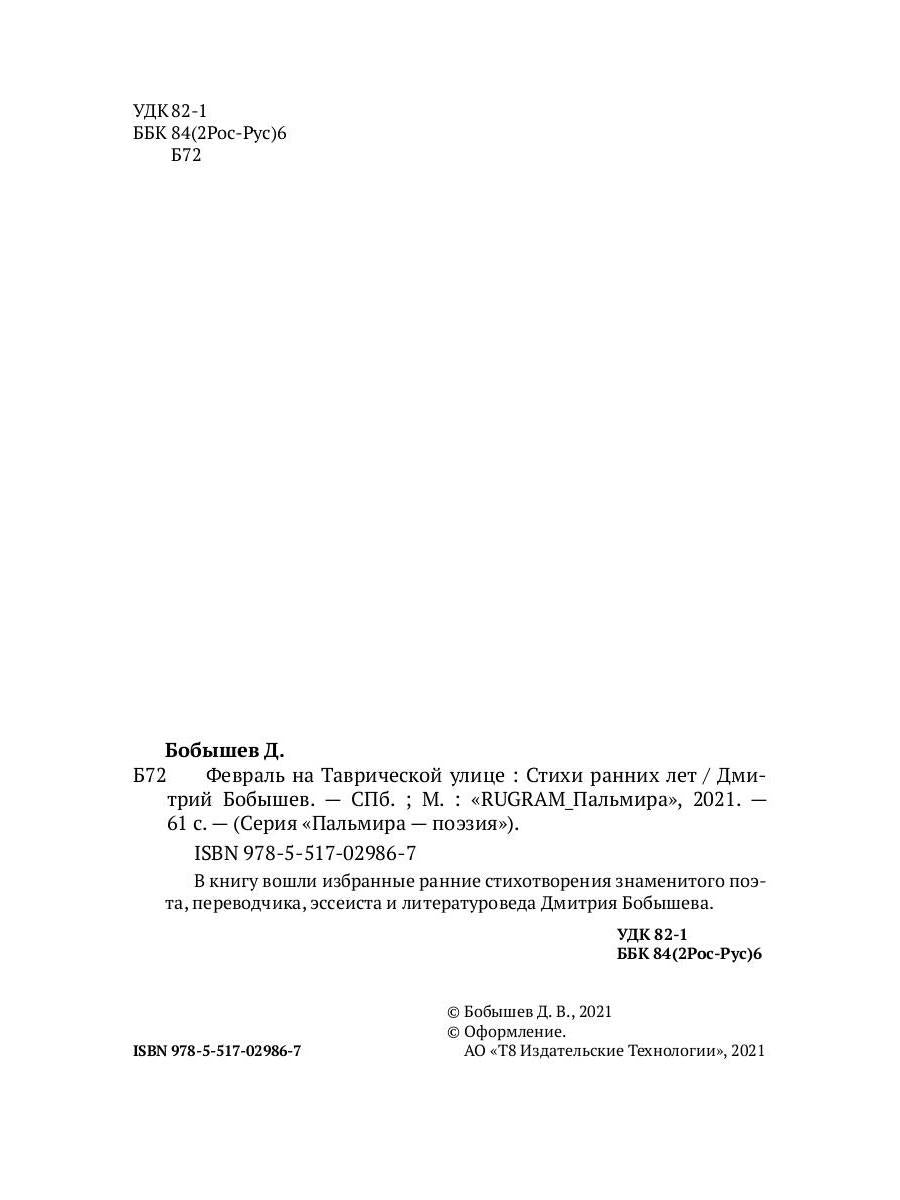 Handling time: 19 days Автор: Бобышев Дмитрий, «Февраль на Таврической улице»: В книгу вошли избранные ранние стихотворения знаменитого поэта, переводчика, эссеиста и литературоведа Дмитрия Бобышева.