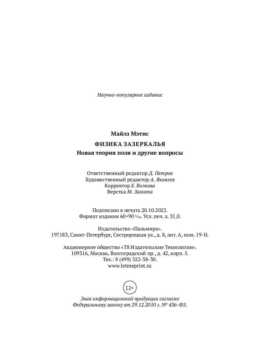Handling time: 19 days Автор: Мэтис М., «Физика зазеркалья: Новая теория поля и другие вопросы»: "Физика зазеркалья" - вызов традиционным представлениям науки, попытка найти ответы на ее главные вопросы, проникая за фасад математических формул. Вопреки многим современным ученым, автор книги убежден, что физика только начинает свою настоящую жизнь, но ей непременно надо вернуть содержательность.