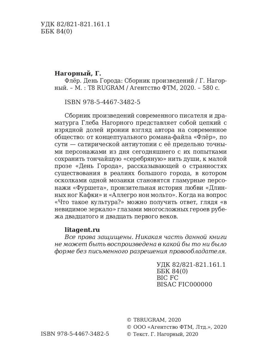 Handling time: 19 days Автор: Нагорный Г., «Флер. День города: сборник произведений»: Сборник произведений современного писателя и драматурга Глеба Нагорного представляет собой цепкий с изрядной долей иронии взгляд автора на современное общество: от концептуального романа-файла «Флёр», по сути — сатирической антиутопии с её предельно точными персонажами из дня сегодняшнего с их попытками сохранить тончайшую «серебряную» нить души, к малой прозе «День Города», рассказывающей о странностях существования в реалиях большого города, в котором осколками одной мозаики становятся гламурные персонажи «Фуршета», пронзительная история любви «Длинных ног Кафки» и «Аллегро нон мольто». Когда на вопрос «Что такое культура?» можно получить ответ, глядя «в невидимое зеркало» глазами многосложных героев рубежа двадцатого и двадцать первого веков.