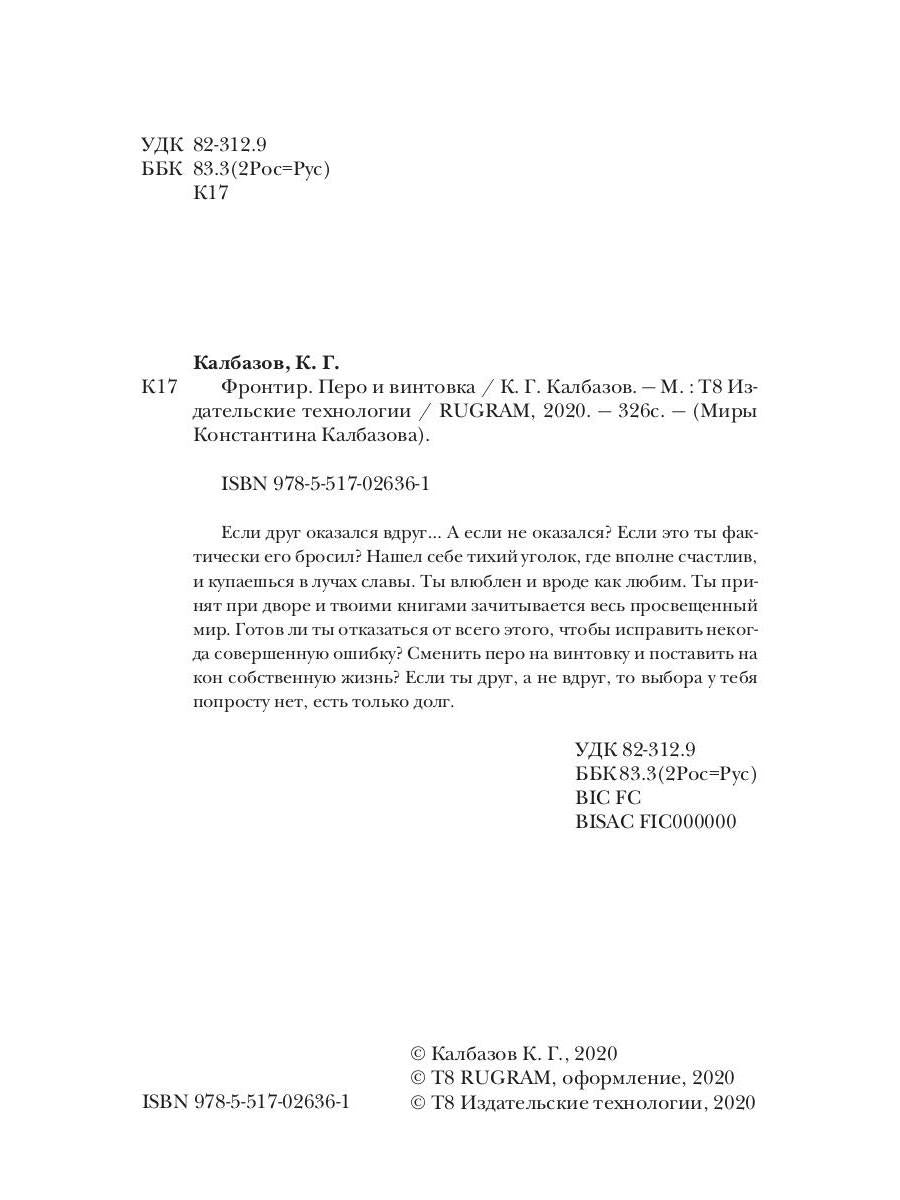 Handling time: 19 days Автор: Калбазов Константин, «Фронтир. Книга 2. Перо и винтовка»: Если друг оказался вдруг... А если не оказался? Если это ты фактически его бросил? Нашел себе тихий уголок, где вполне счастлив, и купаешься в лучах славы. Ты влюблен и вроде как любим. Ты принят при дворе и твоими книгами зачитывается весь просвещенный мир. Готов ли ты отказаться от всего этого, чтобы исправить некогда совершенную ошибку? Сменить перо на винтовку и поставить на кон собственную жизнь? Если ты друг, а не вдруг, то выбора у тебя попросту нет, есть только долг.