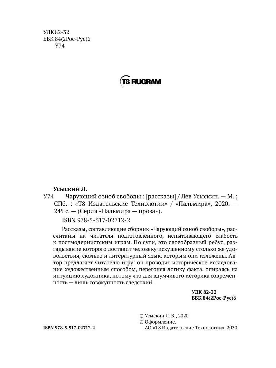 Handling time: 19 days Автор: Усыскин Л., «Чарующий озноб свободы: рассказы»: Рассказы, составляющие сборник «Чарующий озноб свободы», рассчитаны на читателя подготовленного, испытывающего слабость к постмодернистским играм. По сути, это своеобразный ребус, разгадывание которого доставит человеку искушенному столько же удовольствия, сколько и литературный язык, которым они изложены. Автор предлагает читателю игру: он проводит историческое исследование художественным способом, перегоняя логику факта, опираясь на интуицию художника, потому что для вдумчивого историка современность — лишь совокупность следствий.