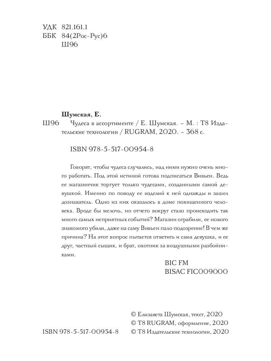 Handling time: 19 days Автор: Шумская Е., «Чудеса в ассортименте»: Говорят, чтобы чудеса случались, над ними нужно очень много работать. Под этой истиной готова подписаться Вивьен. Ведь ее магазинчик торгует только чудесами, созданными самой девушкой. Именно по поводу ее изделий к ней однажды и зашел дознаватель. Одно из них оказалось в доме похищенного человека. Вроде бы мелочь, но отчего вокруг стало происходить так много самых неприятных событий? Магазин ограбили, ее нового знакомого убили, даже на саму Вивьен пало подозрение! В чем же причина? На этот вопрос пытается ответить и сама девушка, и ее друг, частный сыщик, я брат, охотник за воздушными разбойниками.