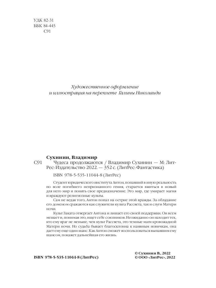 Handling time: 19 days Автор: Сухинин Владимир, «Чудеса продолжаются»: Студент юридического института Антон, попавший в иную реальность по воле погибшего непризнанного гения, старается вжиться в новый для него мир и понять свое предназначение. Это мир, где умирает магия и враждуют религиозные культы. Сам не ведая того, Антон попал на острие этой вражды. За обладание его доменом сражаются как служители культа Рассвета, так и слуги Матери ночи. Культ Заката отвергает Антона и лишает его своей поддержки. Он всем мешает и, понимая это, ищет себе союзников. Неожиданно он находит тех, кто ему враг не меньше, чем культ Рассвета, это темные маги кровожадной Матери ночи. Но судьба бывает благосклонна к наивным новичкам, она дает ему еще один шанс. Как Антон сможет воспользоваться выпавшим ему шансом, покажет дальнейшая его жизнь.