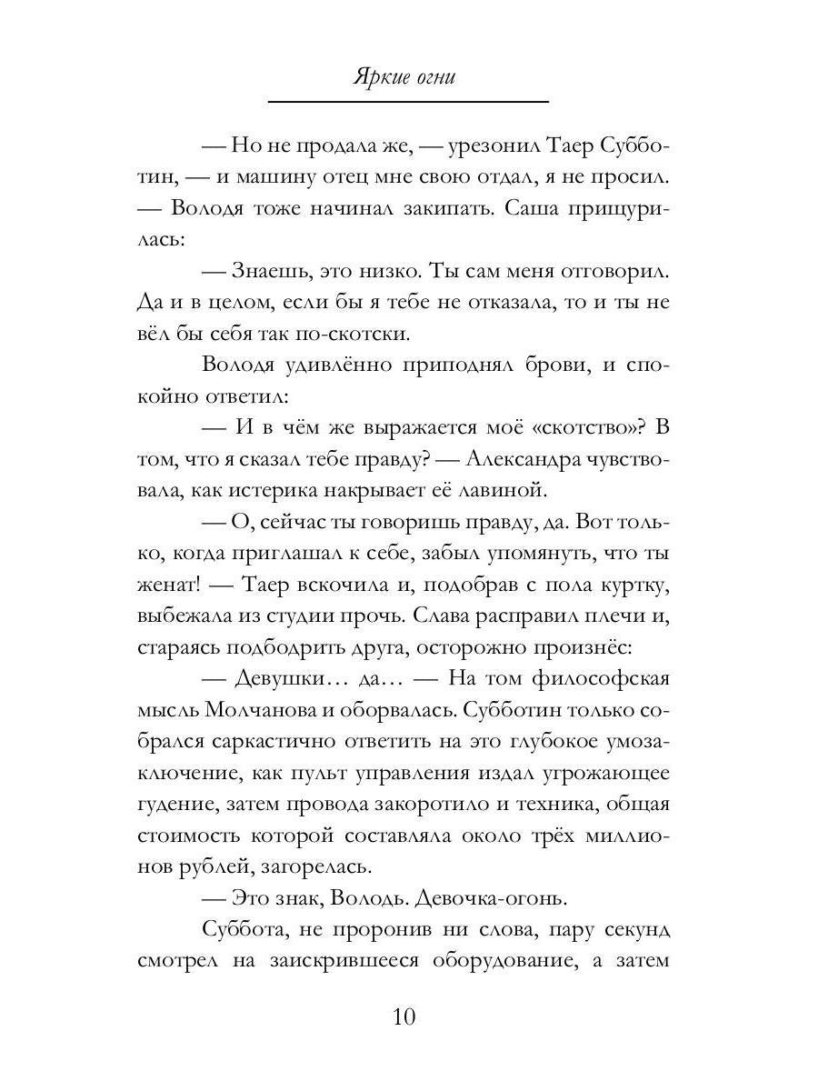 Handling time: 19 days Автор: Тимофеева Алена, «Яркие огни»: Радиоведущая, менеджер среднего звена, риелтор и бывшая балерина… Яркие огни большого города завлекают на свой свет Алю и Сергея из Ярославской области. Аля мечтает о лучшей жизни в Москве вместе с любимым человеком и хочет навсегда забыть о преследующих Сергея долгах. Митя сбегает в столицу из Питера после романтических неудач, а Майя грезила ещё в родной Казани о выступлении в Большом. Судьба сводит всех четверых в «золотой башне» и когда они объединяются, их жизни меняют направление.
