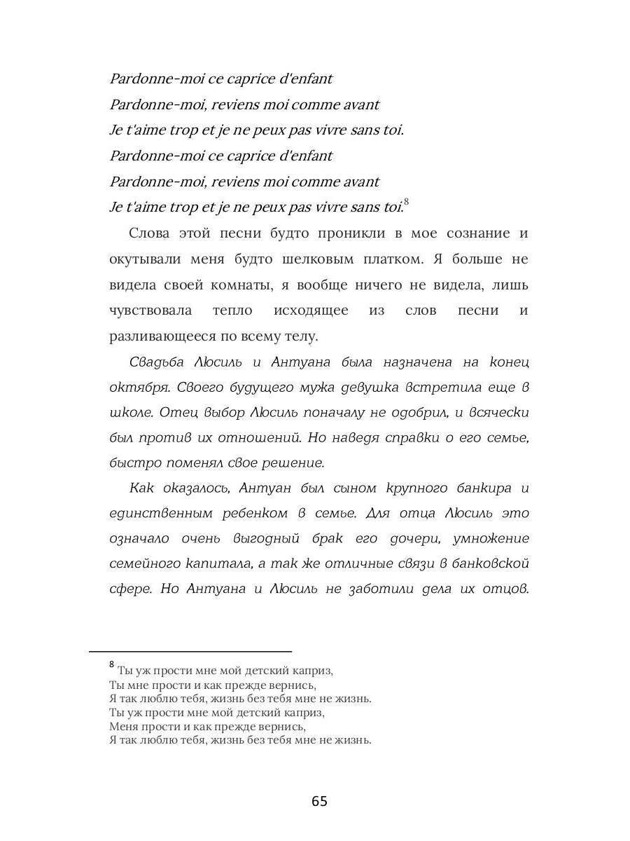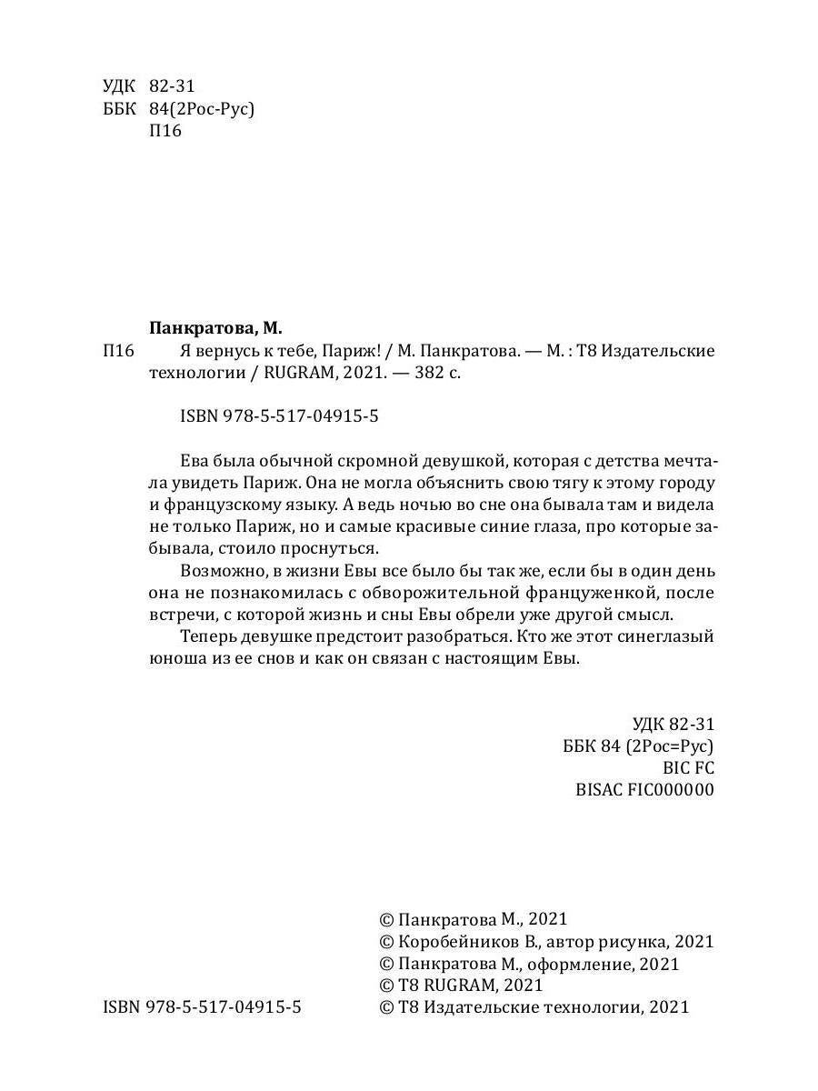 Handling time: 19 days Автор: Панкратова Мария, «Я вернусь к тебе, Париж!»: Ева была обычной скромной девушкой, которая с детства мечтала увидеть Париж. Она не могла объяснить свою тягу к этому городу и французскому языку. А ведь ночью во сне она бывала там и видела не только Париж, но и самые красивые синие глаза, про которые забывала, стоило проснуться. Возможно, в жизни Евы все было бы так же, если бы в один день она не познакомилась с обворожительной француженкой, после встречи, с которой жизнь и сны Евы обрели уже другой смысл. Теперь девушке предстоит разобраться. Кто же этот синеглазый юноша из ее снов и как он связан с настоящим Евы.
