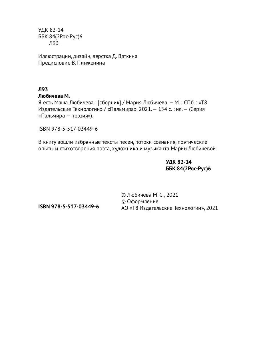 Handling time: 19 days Автор: Любичева Мария, «Я есть Маша Любичева: сборник»: В книгу вошли избранные тексты песен, потоки сознания, поэтические опыты и стихотворения поэта, художника и музыканта Марии Любичевой.