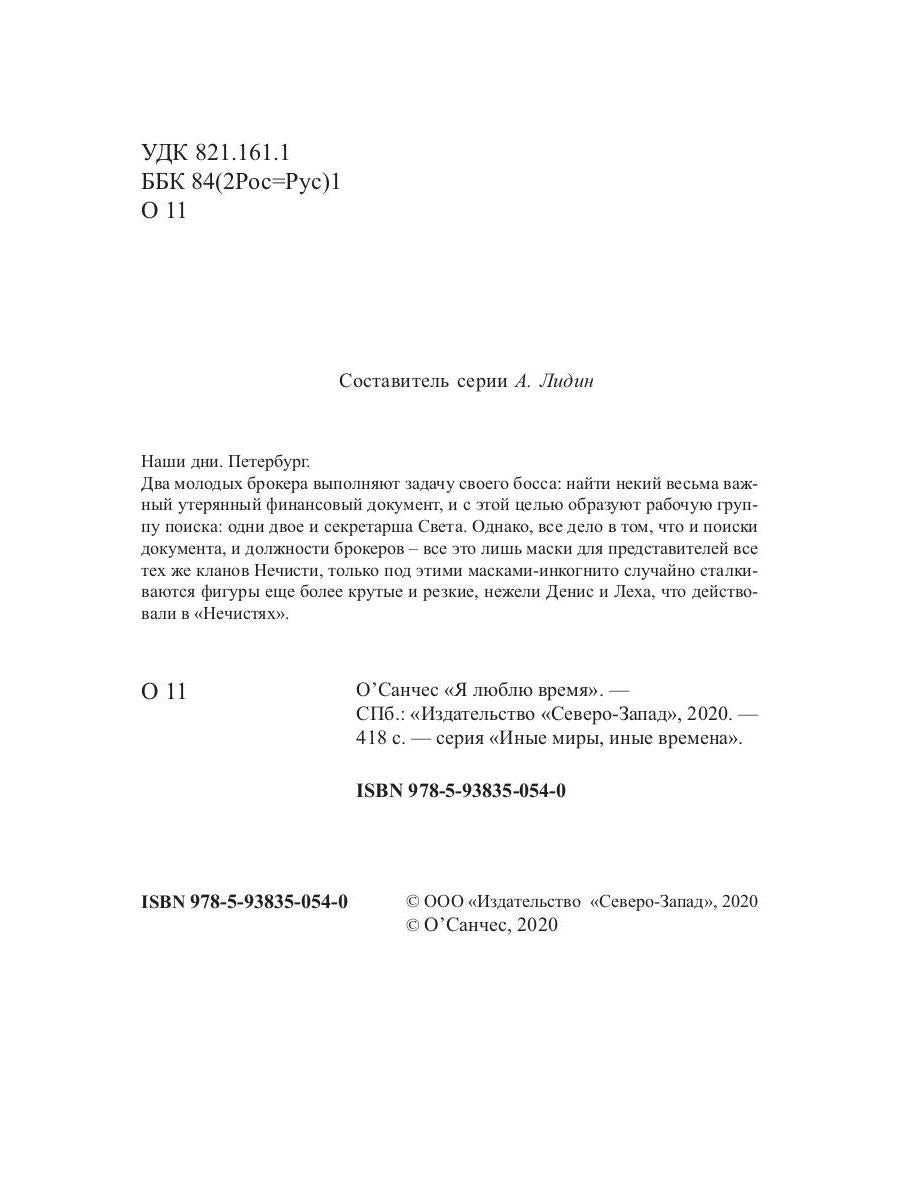 Handling time: 19 days Автор: О’Санчес, «Я люблю время»: Наши дни. Петербург. Два молодых брокера выполняют задачу своего босса: найти некий весьма важный утерянный финансовый документ, и с этой целью образуют рабочую группу поиска: одни двое и секретарша Света. Однако, все дело в том, что и поиски документа, и должности брокеров – все это лишь маски для представителей все тех же кланов Нечисти, только под этими масками-инкогнито случайно сталкиваются фигуры еще более крутые и резкие, нежели Денис и Леха, что действовали в «Нечистях».